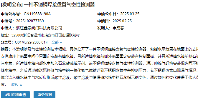 2025年3月25日,浙江鑫泰閥門科技有限公司成功申請(qǐng)一項(xiàng)名為“一種不銹鋼焊接盤管氣密性檢測(cè)器”專利,申請(qǐng)公布號(hào)為CN119688190A,申請(qǐng)日期為2025年2月25日。